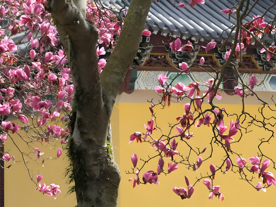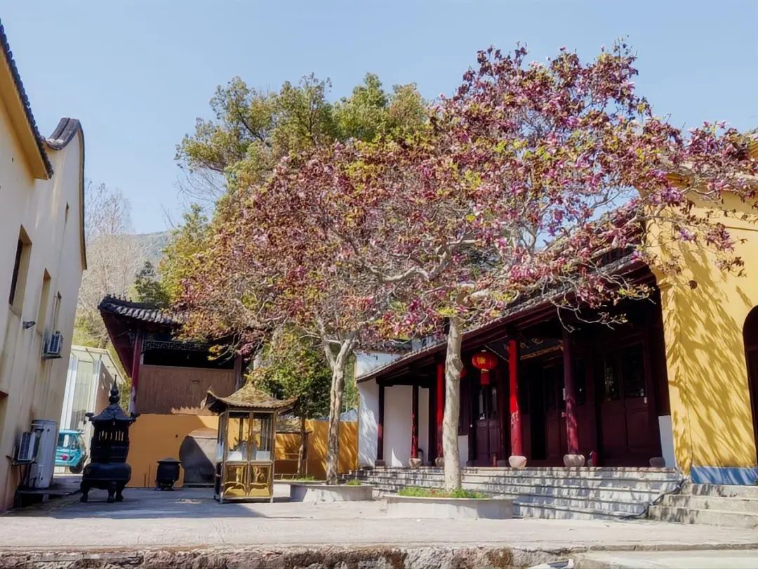 早上8:45,大巴準時從園區(qū)啟程,在陽光明媚中駛向?qū)幉ㄏ笊綁︻^鎮(zhèn)舫前村。抵達智門禪寺時,茶園環(huán)繞,竹海綿延,百年紫玉蘭正值花期。大家或駐足欣賞古剎花影,或在禪寺咖啡館品鑒特色飲品,于傳統(tǒng)與現(xiàn)代交融中開啟這一天的芳菲之旅。