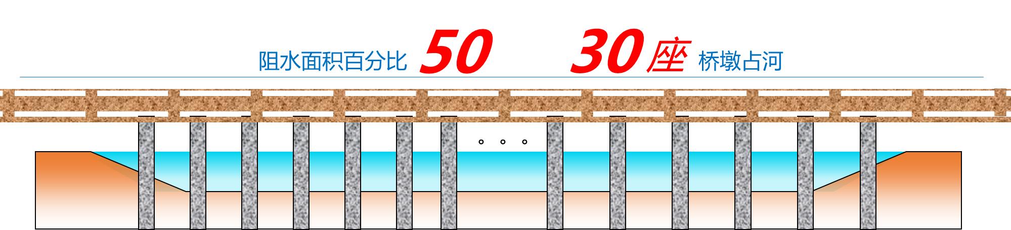 根據(jù)原設(shè)計(jì),共有30座橋墩占用河道, 20年一遇設(shè)計(jì)水位條件下,橋墩阻水面積百分比達(dá)到50%以上,不符合《浙江省涉河橋梁水利技術(shù)規(guī)定》關(guān)于“跨越III級(jí)及以下堤防以及無堤防河道的橋梁的阻水面積百分比不宜大于6%,不得超過8%。”的要求