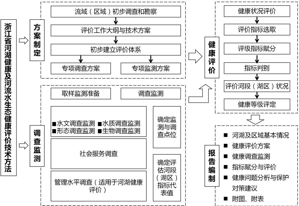 根據(jù)《浙江省河湖健康及水生態(tài)健康評價指南(試行)》要求,將奉化江作為評價單元,并劃分評價河段。在評價河段處設(shè)置監(jiān)測斷面,構(gòu)建河流水文、水質(zhì)、形態(tài)、生物、社會服務(wù)及河湖管理六大類的綜合評價體系,通過采集各監(jiān)測斷面的生物樣品,對樣品進行實驗室分析處理,得出各指標的監(jiān)測數(shù)據(jù)。最后根據(jù)多指標綜合分析評價法進行奉化江干流河流健康得分計算,利用不同顏色進行表征,直觀地表示全流域河流健康狀況。