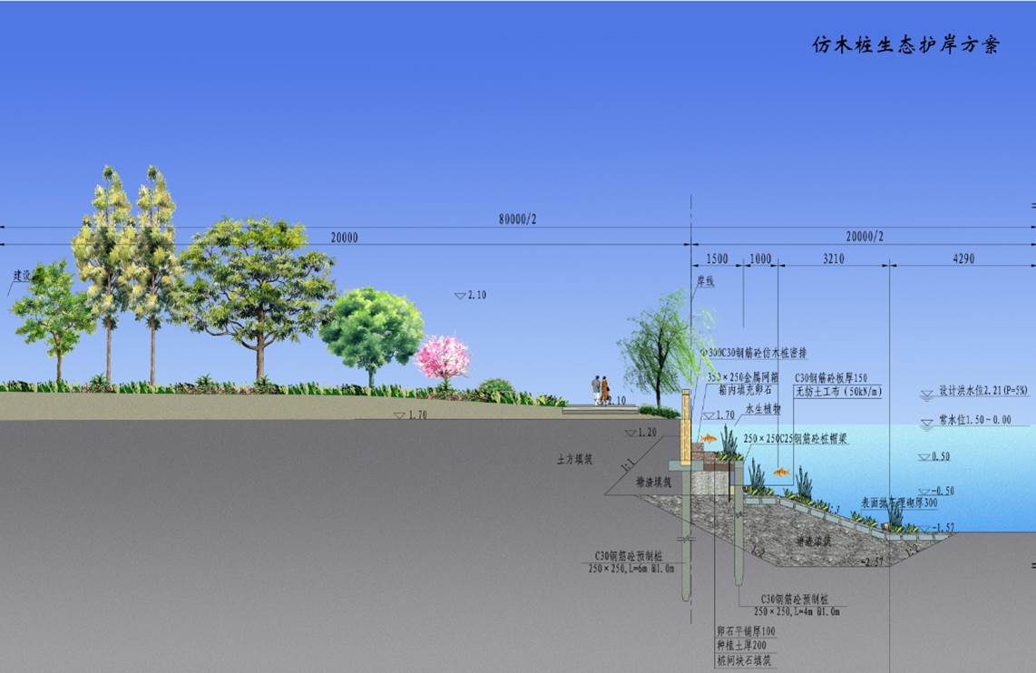 工程位于海曙區(qū)西側,南起鄞江,北至姚江,為實現(xiàn)對海曙西側山區(qū)洪水的攔截,共整治河道長24km,建設閘站40座,閘門總凈寬554m,泵站22m3/s,改建新建橋梁42座。其中有3.5km與G228國道并線,為協(xié)調(diào)國道與河道之間用地布局,通過優(yōu)化河道斷面型式和堤線線位,實現(xiàn)了對土地的集約利用,打造一條海曙西部交通和河道的靚麗風景線。