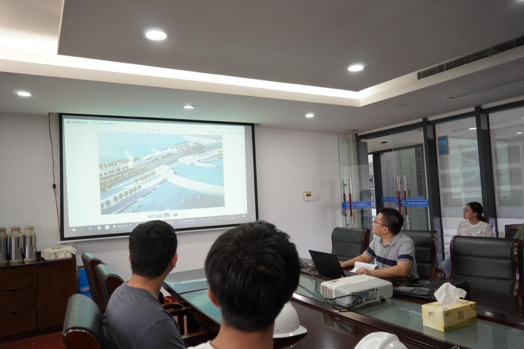 接著,研學隊伍來到會議室,胡經理結合建設目標、工程建設客觀因素、工程效益和景觀效果,詳細講解設計思路、問題對策和創(chuàng)新點,為大家上了一堂嚴謹生動的復盤課。比如海堤采用緩坡入海,外側采用異形結構塊消浪,內坡采用生態(tài)水工磚美化,使海堤具備結構和生態(tài)景觀雙重效果;船閘與海堤銜接段軟土處理采用新型技術應用——樁網復合地基,形成“樁-網-土”協同工作共同承載的復合工藝。在座職工認真聆聽梅山灣如何從曾經的“漲潮黃沙水,落潮滿目泥”到如今的“水清、岸綠、波寧、潮平”,受益匪淺。