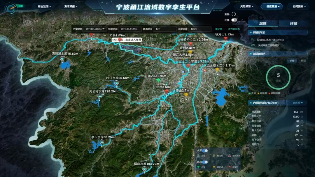 目前,基于寧波甬江流域數(shù)字孿生平臺(tái)打造的防洪應(yīng)用已完成“綜合監(jiān)測(cè)、洪澇預(yù)報(bào)、風(fēng)險(xiǎn)預(yù)警、仿真預(yù)演、協(xié)同預(yù)案”5大功能板塊的開發(fā)和“三江堤防、沿海海塘、重點(diǎn)水庫、重要設(shè)施內(nèi)澇”4個(gè)“四預(yù)”場(chǎng)景的應(yīng)用。