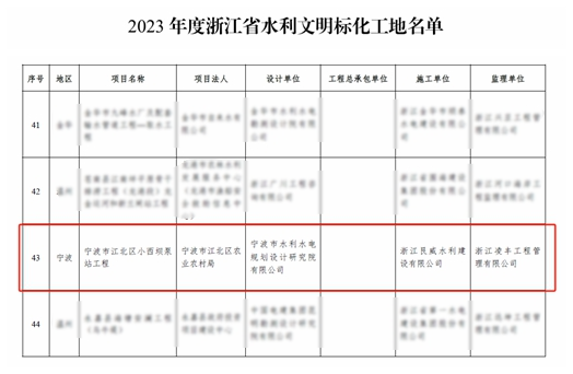近日,經(jīng)浙江省水利廳2023年度浙江省水利文明標(biāo)化工地名單公布,我院承擔(dān)全過(guò)程工程咨詢的寧波市江北區(qū)小西壩泵站工程喜獲“浙江省文明標(biāo)化工地”稱(chēng)號(hào),成為寧波市水利行業(yè)的標(biāo)桿工程。